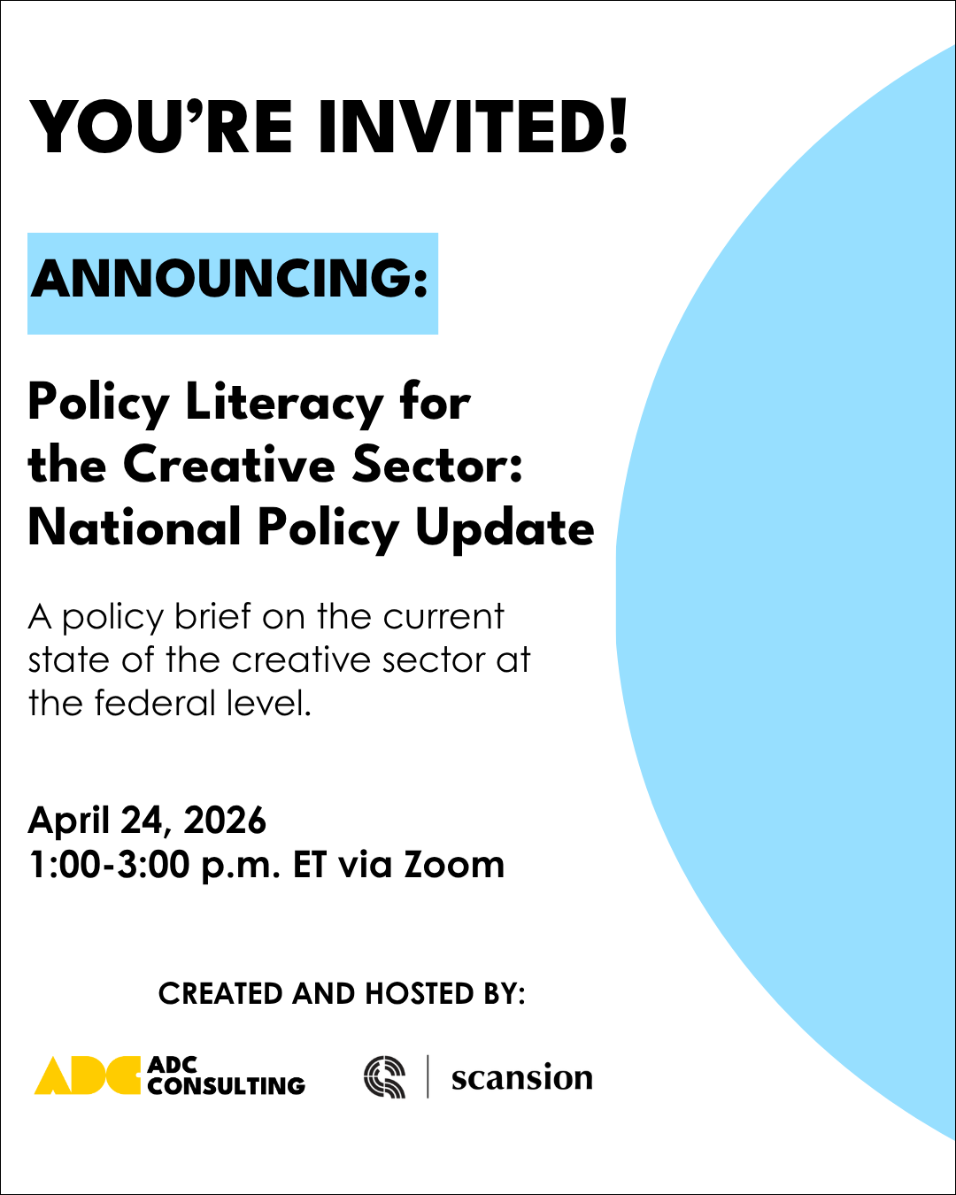 Join us on April 24, 2026 from 1:00 p.m. - 3:00 p.m. ET, for Policy Literacy for the Creative Sector National Update, facilitated by Alejandra Duque Cifuentes of ADC Consulting and David Holland of Scansion.